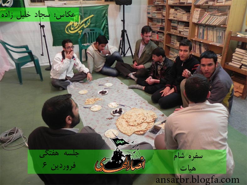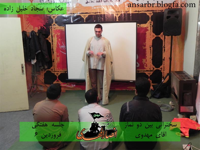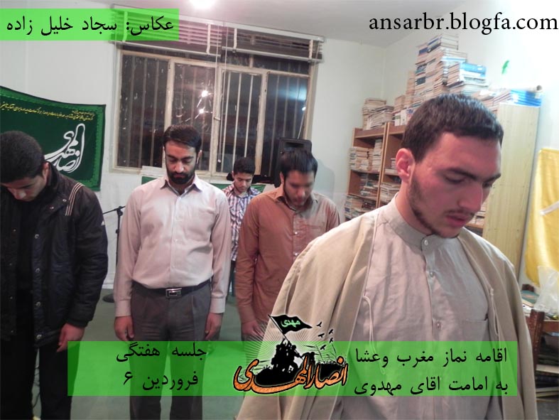 برنامه هفتگی هیات نیز مثل همیشه با اقامه نماز مغرب وعشا به امامت اقای سید سعید مهدوی نیا اغاز شد سخنرانی بین دو نماز ایشون و بعد از نماز قرائت زیارت ال یاسین وبعد از ان مداحی وسینه زنی با مداحی : اقای مجتبی جهانی وبعد از ان هم پخش کلیپ وبعد هم پذیرایی هیات
